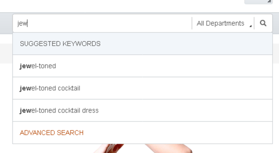 Busque la cadena "joya" en el escaparate. El motor de búsqueda Solr sugerirá nombres de productos concatenados por guiones, como en el siguiente resultado:
