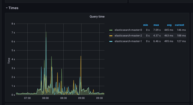 Le graphique est simple à comprendre et peut être utilisé pour identifier rapidement les problèmes. Tout saut soudain dans les valeurs de temps de requête maximal indiquerait un problème grave dans le cluster, et une investigation plus approfondie est obligatoire. Le graphique représente une situation dans laquelle le temps de traitement de la requête est perturbé pendant une période plus longue, et cette période doit être corrélée avec les autres affichages pour déterminer la source du problème.