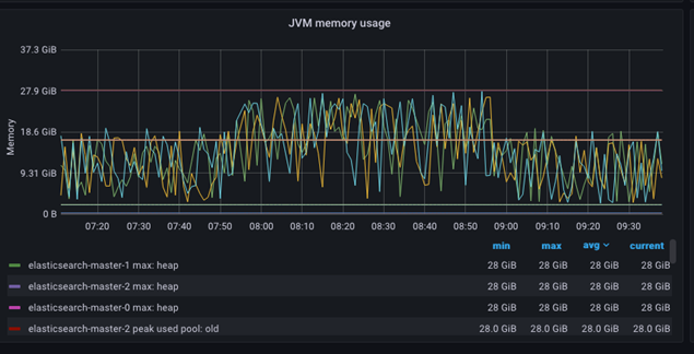 L'espace de segment de mémoire total est surévalué et pourrait prêter à confusion. Plusieurs métriques sont signalées, mais en raison de la configuration du segment de mémoire ES (min=max), seul le segment de mémoire utilisée par Elasticsearch-master-NNN s'affiche.