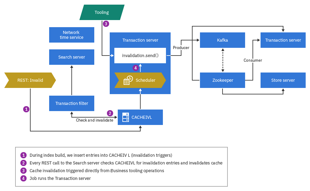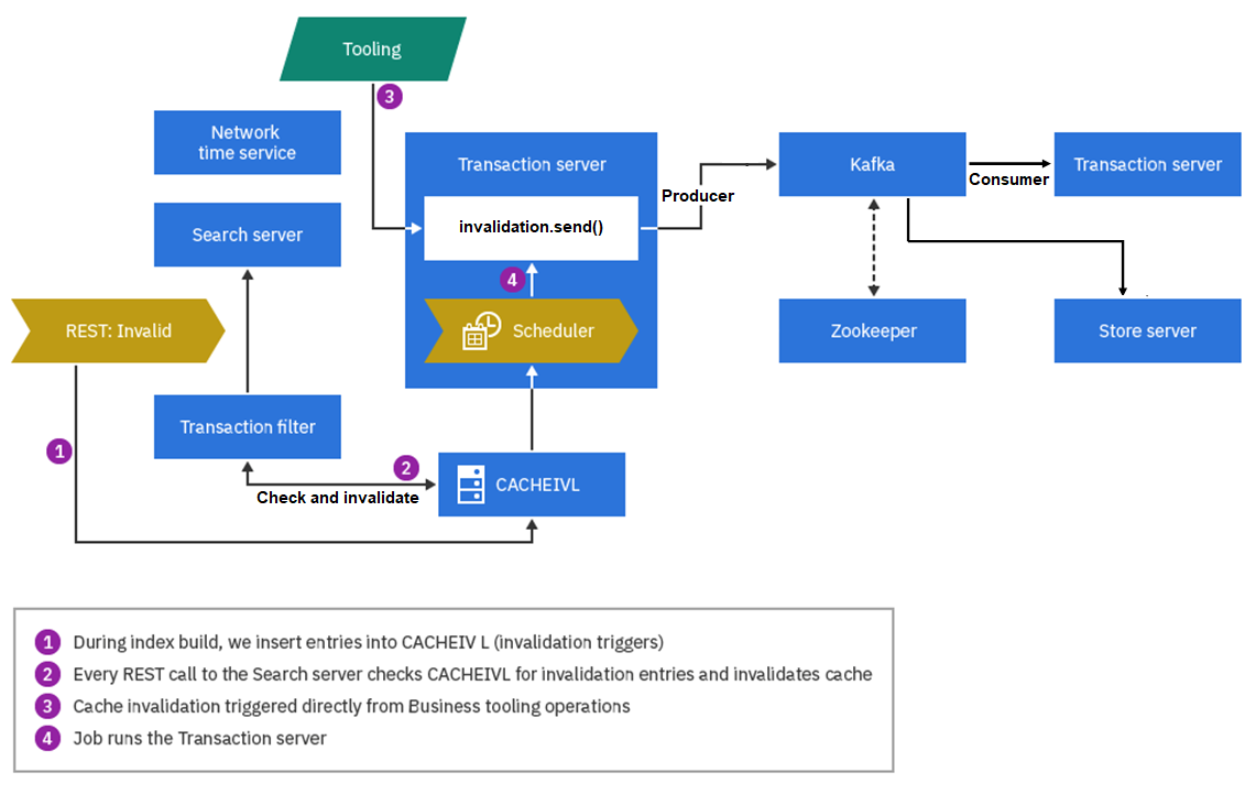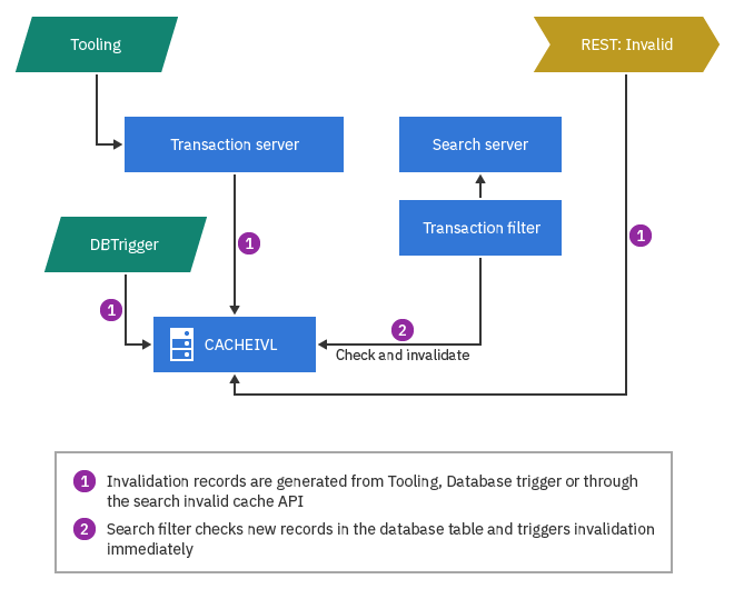 Le serveur de recherche utilise CACHEIVL pour coordonner l'invalidation du cache. Toutes les requêtes REST qui sont acheminées vers le serveur de recherche passent par un filtre servlet nommé TransactionFilter. A des heures préconfigurées, le filtre vérifie les enregistrements de table CACHEIVL nouvellement insérés. Ceux-ci sont sélectionnés pour l'invalidation.