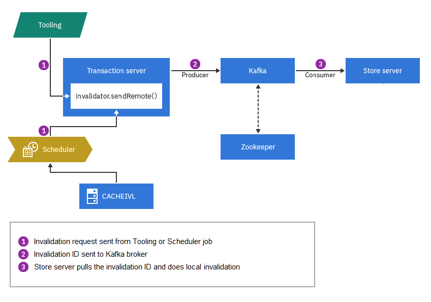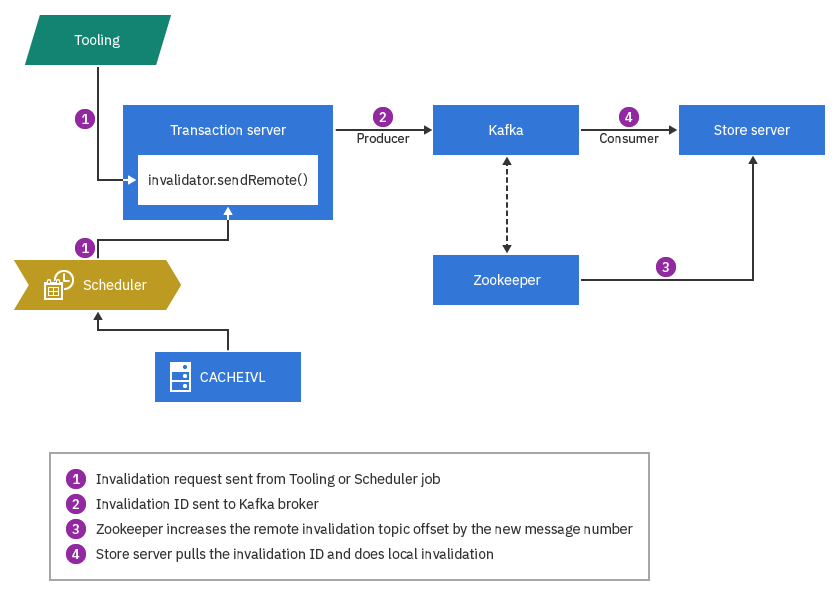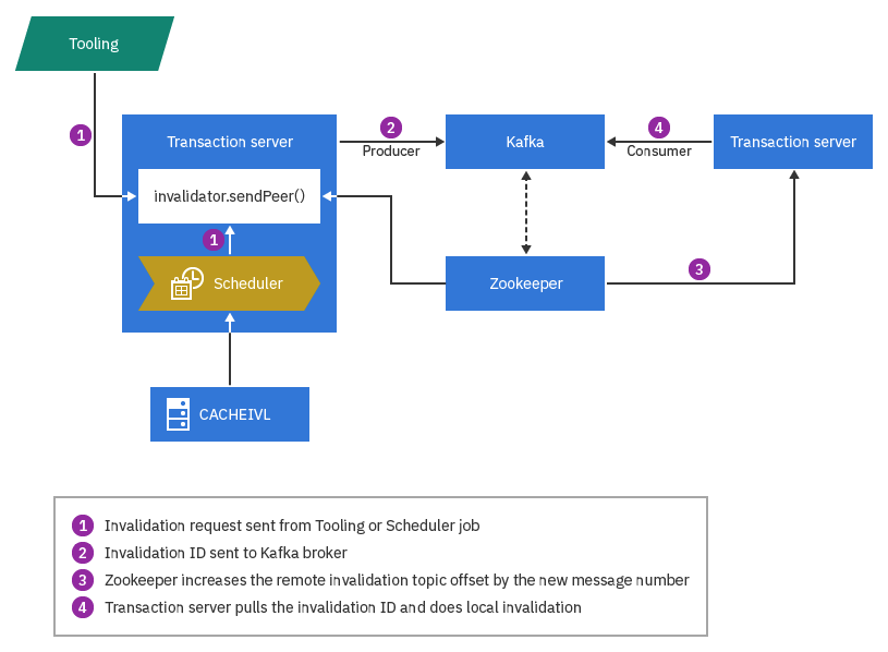 Vous pouvez utiliser Apache Kafka et Apache ZooKeeper pour effectuer l'invalidation du cache. Les tâches d'invalidation peuvent être exécutées à partir de serveurs locaux ou distants.
