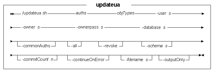 updateua.sh -database dbspec -commonAuths -tables -views -functions -procedures -owner db2admin -ownerpass password -user db2inst1user -schema wcs