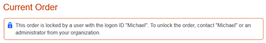 Pour verrouiller une commande enregistrée verrouillée par un autre administrateur : - Dans la page Commandes enregistrées, l'administrateur acheteur clique sur le numéro de commande. La page Détails de la commande enregistrée est affichée, et un message indique qui a verrouillé la commande. Remarque : Vous souhaitez peut-être vérifier auprès de l'administrateur qui a verrouillé la commande avant de prendre le contrôle d'un verrou.