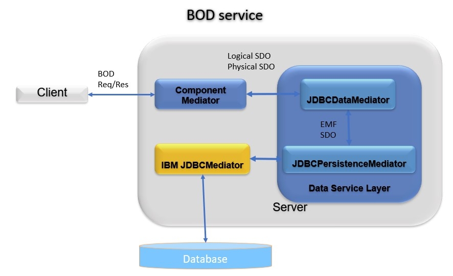 Lorsqu'un client envoie une demande de service Business Object Document (BOD) au serveur, le framework de service BOD du serveur la transmet au médiateur de composant correspondant. S'il s'agit d'une demande de processus ou de modification, la zone de données dans le BOD est un SDO logique. Le médiateur le convertira en une liste de SDO physiques et le JDBCDataMediator de la couche de service de données (DSL) enverra ces SDO physiques au service JDBCMediator d'IBM à des fins de persistance. S'il s'agit d'une demande de lecture, le médiateur de lecture obtiendra le XPath et le profil d'accès dans le BOD et les enverra à la DSL. La DSL obtiendra les SQL pertinentes et le service JDBCDataMediator dans HCL Commerce avant d'envoyer les SQL au service JDBCMediator d'IBM pour qu'il récupère le contenu de la base de données. Le service JDBCDataMediator d'IBM créera un graphique SDO physique basé sur le résultat de la requête fourni par la base de données, puis renverra ce graphique au service JDBCDataMediator. Quand le médiateur de composants obtiendra le graphique SDO physique, il le reconvertira vers le SDO logique et le framework de service BOD construira un BOD et le renverra au client.