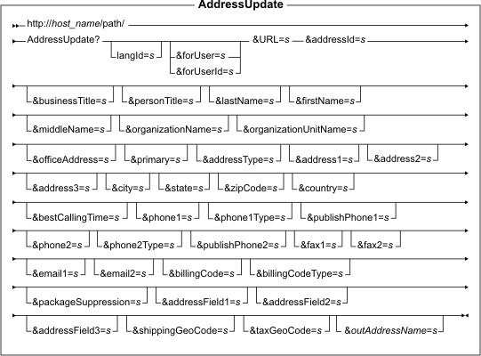 Cette commande met à jour l'entrée d'adresse d'un utilisateur. Si le paramètre addressId n'est pas fourni, la commande AddressAdd est appelée pour ajouter une nouvelle adresse. Utilisez cette commande avec SSL (Secure Sockets Layer) pour garantir le chiffrement du mot de passe de connexion et des informations personnelles du membre. Pour ce faire, entrez la commande avec le protocole sécurisé HTTPS.