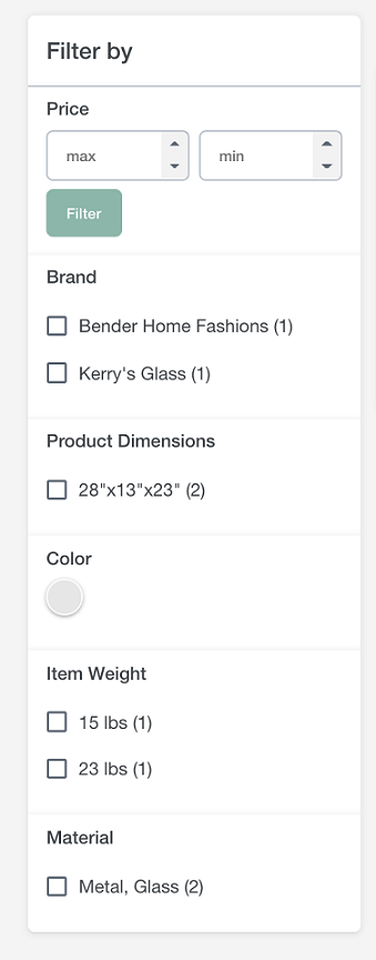 Le widget Navigation à facettes permet d'afficher un filtre de facettes sur une page de catégorie de liste de produits. Ce widget extrait et affiche automatiquement une liste de facettes, comme les facettes Marque, Prix et Couleur. Pour chaque valeur de facette, le nombre d'entrées de catalogue obtenues par la recherche s'affiche entre parenthèses. Ce widget peut être utilisé avec le widget Liste de produits. Généralement, il se situe dans la barre latérale gauche de la page.