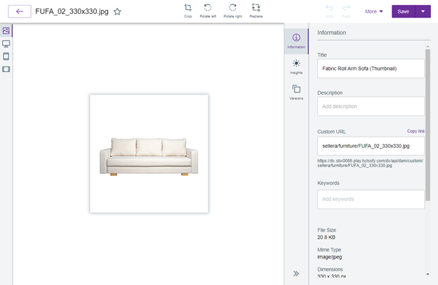 Ensuite, une URL personnalisée peut être affectée aux fichiers image pour maintenir la hiérarchie de répertoires définie par le vendeur de la place de marché. A l'aide de l'exemple de la méthode 2, une image miniature est accessible à partir de l'URL de l'image. Par exemple, dans l'URL de l'image https://dx.sbx0086.play.hclsofy.com/dx/api/dam/custom/sellera/furniture/FUFA_02_330x330.jpg, l'URL de base est https://dx.sbx0086.play.hclsofy.com/dx/api/dam/custom et le chemin personnalisé ajouté à l'image est /sellera/furniture/FUFA_02_330x330.jpg .