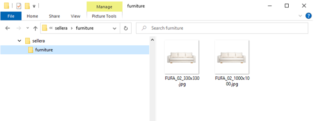 Par exemple, le vendeur A souhaite charger un canapé blanc sur la place de marché. Il y a deux images de ce canapé blanc ; l'une pour la miniature et l'autre pour l'image complète du produit. Le vendeur A souhaite héberger deux images dans le répertoire sellera/furniture/, comme illustré dans l'image ci-dessous. Le vendeur A conserve ces images à l'emplacement sellera/furniture/ au format compressé et envoie le fichier compressé à l'opérateur de la place de marché.