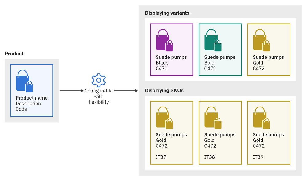 - SKU au niveau du produit. Dans ce modèle, les produits sont des modèles pour les SKU et ne conservent que des informations de base et un attribut descriptif. Chaque SKU contiendra un attribut de définition. Dans ce modèle de données, le personnel de marchandisage peut définir le prix et contrôler la visibilité sur un produit, ou sur une SKU.