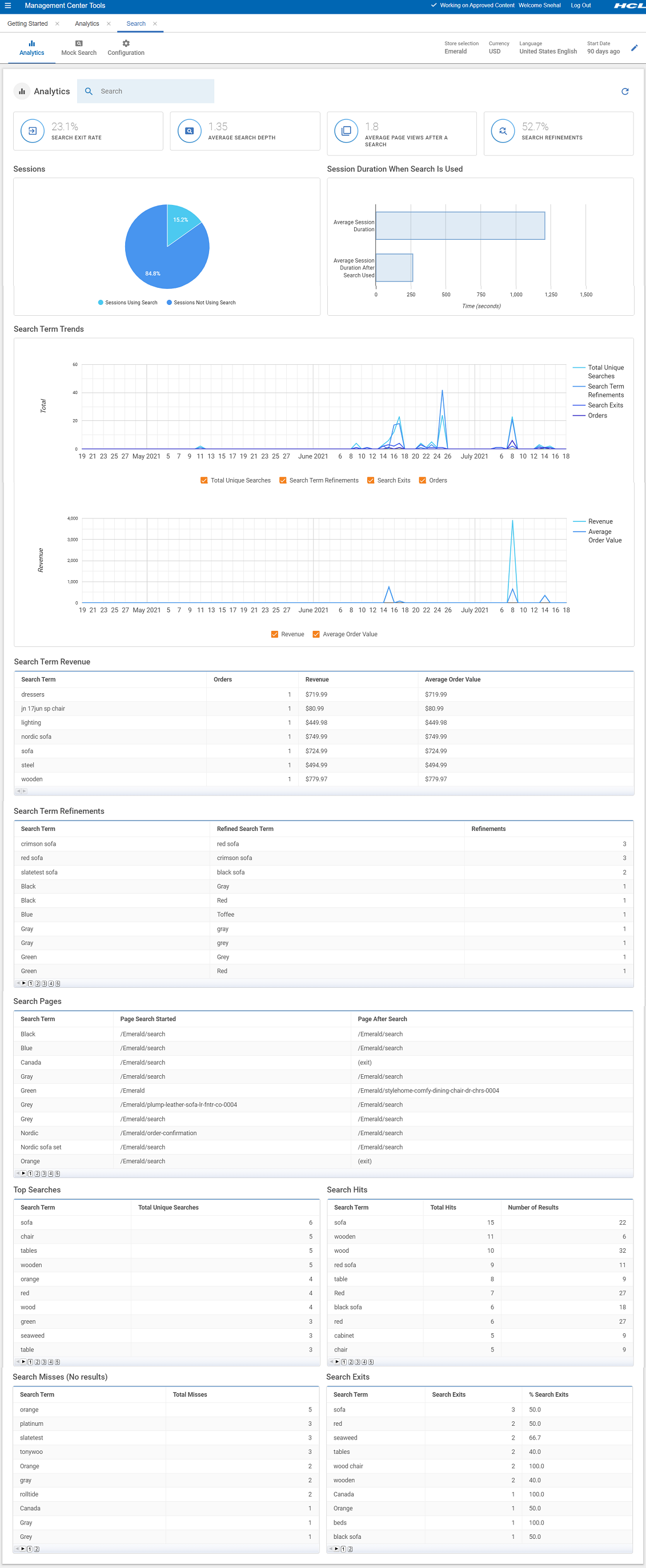 La page Analyse affiche des informations relatives à la façon dont les clients utilisent la fonction Rechercher dans le magasin. Actuellement, seuls les magasins utilisant la recherche élastique sont pris en charge. Les utilisateurs ne pourront visualiser le tableau de bord analytique dans l'outil Recherche qu'après avoir terminé la configuration du tableau de bord.