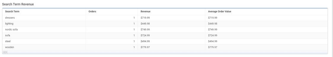 | Nombre total de recherches uniques | Nombre total de mots clés uniques provenant de recherches internes dans une session. Par exemple, si des "chaussures" ont été recherchées 3 fois dans une session, elles ne seront comptabilisées qu'une seule fois. |