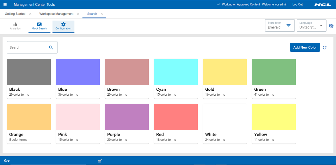 Une fois dans l'onglet configuration, une liste des familles de couleurs que le moteur de recherche comprend vous sera présentée. A partir de là, vous pouvez rechercher une couleur existante, ajouter, mettre à jour ou supprimer des couleurs des familles de couleurs. Lors du processus d'indexation de recherche, les couleurs sont automatiquement ajoutées à la configuration de la famille de couleurs en fonction des entrées de catalogue avec certains attributs.