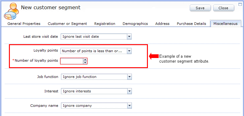 Votre site peut disposer d'un programme de fidélité des clients qui permet à ces derniers d'accumuler des points de fidélité. Les professionnels peuvent souhaiter cibler leur publicité sur certains clients en fonction du nombre de points de fidélité qu'ils possèdent. Pour cela, ils doivent pouvoir créer un segment de clientèle qui cible les clients possédant un certain nombre de points de fidélité. Vous pourriez ainsi ajouter un attribut de segment de clientèle à l'onglet Divers de la vue de propriétés du segment de clientèle, qui se présente comme suit :