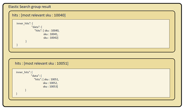 Une zone d'index commune est indexée pour toutes les SKU sous-jacentes du produit, qui est utilisé ultérieurement comme zone de regroupement. Lors de l'interrogation de l'index de recherche, la section qui se réduit est ajoutée à la requête Elasticsearch. Par conséquent, la réponse de la recherche est structurée en occurrences et en innerHits, au lieu d'une occurrence Search. Chaque groupe contient des occurrences et des innerHits de documents connexes. Le nombre de lignes et la pagination s'appliquent au nombre de groupes, plutôt qu'au nombre de documents d'occurrences de recherche renvoyés.