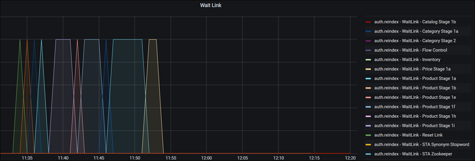 Les graphiques utiles à examiner dans Articles en file d'attente sont les graphiques Service en masse <- XXXX>. Ces groupes de processus envoient les données traitées (documents d'index) à Elasticsearch depuis NiFi. Service en masse - Le produit est le plus essentiel. Utilisez l'horodatage dans WaitLink pour accéder aux étapes correspondantes, car la courbe s'exécute du début à la fin du pipeline Ingest.