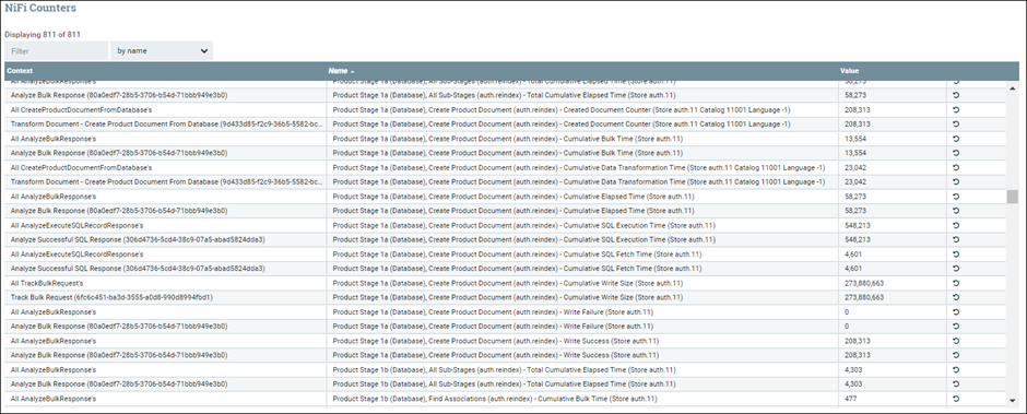 Il se peut que vous ne vouliez pas terminer un pipeline Ingest avant de l'avoir à nouveau exécuté à des fins d'optimisation ou que le processus échoue à un moment au cours du processus Ingest. Dans ces circonstances, les compteurs NiFi peuvent faciliter la génération de rapports pour certaines étapes d'un pipeline Ingest.