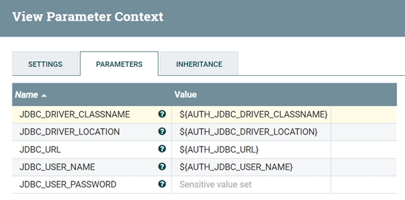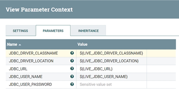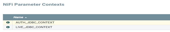 Dans l'interface utilisateur NiFi, le contexte de paramètre AUTH_JDBC_CONTEXT est affecté aux pipelines commençant par auth et commençant par le chargement de données. LIVE_JDBC_CONTEXT est affecté aux pipelines qui commencent par live et push-to-live.