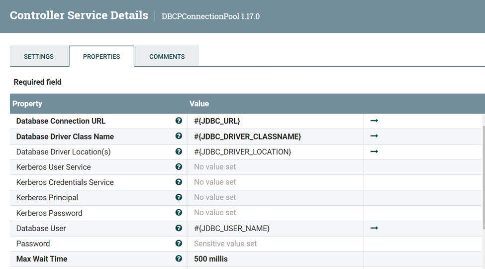 Chaque contexte de paramètre contient la paire nom-valeur comme illustré dans la figure (1). Les valeurs de ce paramètre sont remplies à partir de la variable d'environnement définie dans NiFi. Il s'agit des mêmes variables d'environnement que celles précédemment utilisées dans la définition du descripteur de connecteur. Dans les détails de configuration du groupe de processus, vous pouvez vérifier le nom du contexte de paramètre, qui est lié au groupe de processus comme illustré dans la figure (2). Les paramètres du contexte de paramètre sont accessibles à l'aide du signe # avant le nom du paramètre, par exemple, #{parameterName} comme illustré dans la figure (3).
