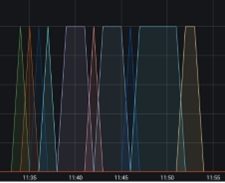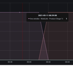 Sous les éléments mis en file d'attente se trouvent des graphiques WaitLink. Les graphiques WaitLink, contrairement aux éléments mis en file d'attente, indiquent l'étape ou le segment est en cours de traitement à un moment donné. En d'autres termes, alors que l'axe X indique l'heure (correspondant au graphique Eléments en file d'attente), l'axe Y affiche le segment actif, avec des valeurs allant de 0 à 1 :