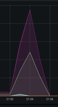 Le graphique "Lien mis en file d'attente" représente le nombre de fichiers de flux mis en file d'attente pour traitement sur un groupe de processeurs donné. Une forte augmentation de la courbe indique que le processeur précédent (ou le groupe de processeurs) traite plus rapidement les données ou que le groupe de processeurs a du mal à suivre le débit global des groupes de processeurs adjacents. Dans l'image ci-dessous, vous pouvez observer une augmentation rapide du nombre d'éléments mis en file d'attente autour de l'horodatage 21.54, indiquant que le processeur ne suit pas le flux entrant :