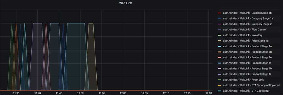 Les valeurs WaitLink et Bucket.Size peuvent être suivies dans Grafana. L'observation des activités et des quantités aide à déterminer le comportement du système et à détecter les segments lents.