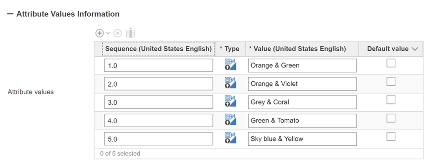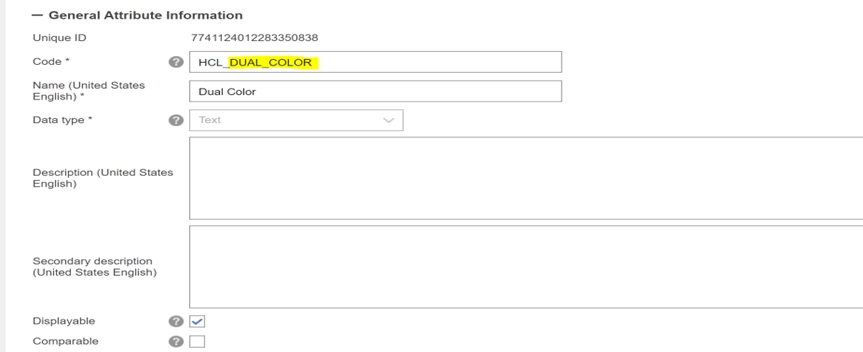 Pour activer la recherche de couleur double dans la vitrine, créez un attribut dans le Management Center for HCL Commerce. Le code d'attribut doit se terminer par dual_color. Ces attributs peuvent être créés en tant qu'attributs de valeur assignés ou prédéfinis. Lorsque vous ajoutez une valeur à cet attribut, elle ne doit pas contenir plus de deux couleurs.