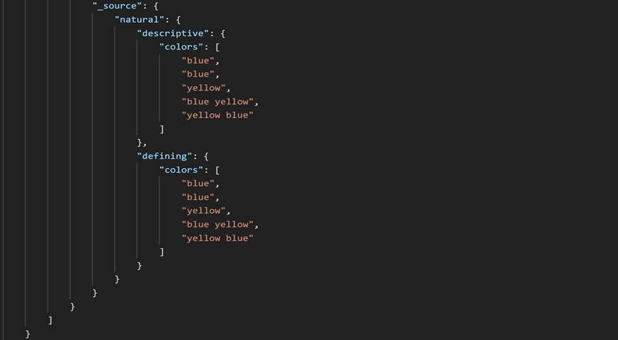 Dans l'index du produit, les détails de couleur de zone natural.descriptive.colors et natural.defining.colors seront ajoutés. Dans le champ naturel, le nom de famille de couleurs sera ajouté pour chaque couleur après le fractionnement par &.