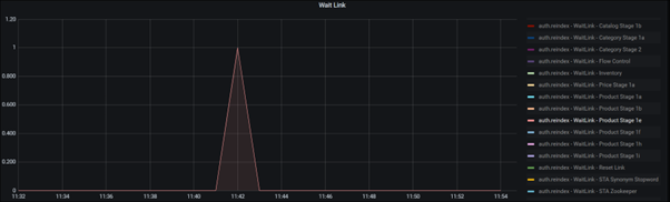 Les graphiques utiles à examiner dans Articles en file d'attente sont les graphiques Service en masse - <XXXX> . Ces groupes de processus envoient les données traitées (documents d'index) à Elasticsearch depuis NiFi. Le plus important est Service en masse - Produit. Etant donné que la courbe commence du début à la fin du pipeline Ingest, nous pouvons utiliser l'horodatage dans Lien d'attente pour obtenir les étapes associées.