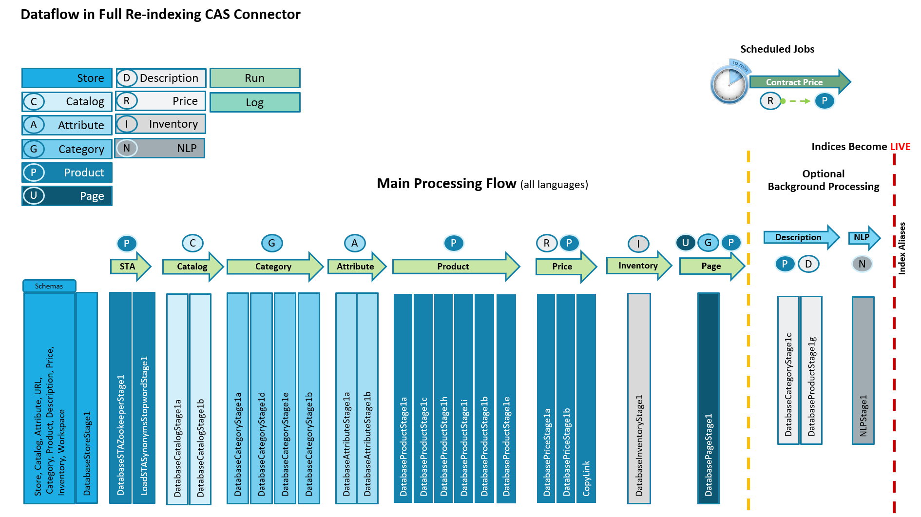 Chaque flux de traitement ne peut prendre en charge qu'un seul magasin et une langue à la fois. Un composant de contrôle de flux est utilisé pour effectuer des flux de données internes récurrents afin de gérer d'autres langues prises en charge. Les URL de référencement et d'autres métadonnées associées sont indexées dans un index d'URL distinct pour la recherche du temps de requête.
