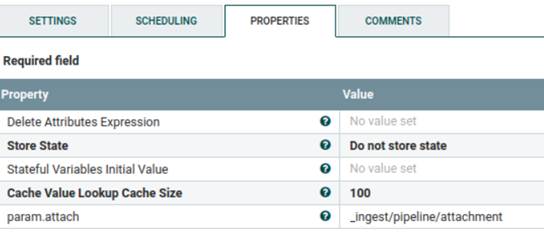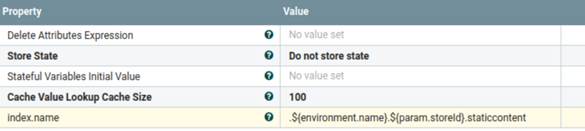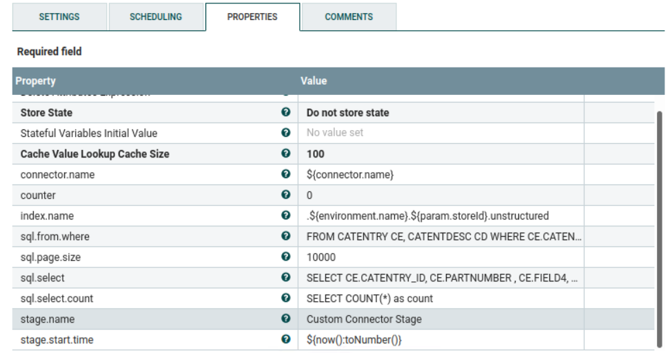 Catentry.field4. Vous pouvez modifier les requêtes et ajouter plusieurs transactions si nécessaire pour définir l'emplacement du fichier pour les entrées de catalogue.UPDATE catentry SET FIELD4 = '/opt/nifi/extDocs/SampleDocs-travel-laptop.docx' WHERE PARTNUMBER = 'CLA022_2203' UPDATE catentry SET FIELD4 = '/opt/nifi/extDocs/SampleDocs-office-laptop.ppt' WHERE PARTNUMBER = 'CLA022_2205'Note: Si vous souhaitez définir l'emplacement du fichier dans un autre tableau, modifiez les propriétés suivantes dans le processeurSet Attributesous custom-UnstructuredIndexDatabaseConnectorPipe-Attachment. Vous pouvez mettre à jour les requêtes selon vos besoins.SELECT COUNT(*) as count FROM CATENTRY CE, CATENTDESC CD WHERE CE.CATENTRY_ID = CD.CATENTRY_ID AND CD.LANGUAGE_ID =-1 AND CE.MARKFORDELETE =0 AND CE.BUYABLE =1 AND CD.PUBLISHED =1 AND ce.FIELD4 IS not NULL AND CE.CATENTRY_ID IN (SELECT C.CATENTRY_ID FROM CATGPENREL R, CATENTRY C WHERE R.CATALOG_ID IN (SELECT CATALOG_ID FROM STORECAT WHERE STOREENT_ID IN (SELECT RELATEDSTORE_ID FROM STOREREL WHERE STATE = 1 AND STRELTYP_ID = -4 AND STORE_ID = ${param.storeId})) AND R.CATENTRY_ID = C.CATENTRY_ID AND C.MARKFORDELETE = 0 AND C.CATENTTYPE_ID <> 'ItemBean') SELECT CE.CATENTRY_ID, CE.PARTNUMBER , CE.FIELD4, CD.NAME, CD.SHORTDESCRIPTION , CD.PUBLISHED FROM CATENTRY CE, CATENTDESC CD WHERE CE.CATENTRY_ID = CD.CATENTRY_ID AND CD.LANGUAGE_ID =-1 AND CE.MARKFORDELETE =0 AND CE.BUYABLE =1 AND CD.PUBLISHED =1 AND ce.FIELD4 IS not NULL AND CE.CATENTRY_ID IN (SELECT C.CATENTRY_ID FROM CATGPENREL R, CATENTRY C WHERE R.CATALOG_ID IN (SELECT CATALOG_ID FROM STORECAT WHERE STOREENT_ID IN (SELECT RELATEDSTORE_ID FROM STOREREL WHERE STATE = 1 AND STRELTYP_ID = -4 AND STORE_ID = ${param.storeId})) AND R.CATENTRY_ID = C.CATENTRY_ID AND C.MARKFORDELETE = 0 AND C.CATENTTYPE_ID <> 'ItemBean')Note: Si vous souhaitez mettre à jour le nom du schéma dans lequel la pièce jointe du fichier sera ingérée, modifiez les propriétés suivantes dans le processeurSet Attributesous custom-UnstructuredIndexDatabaseConnectorPipe-Attachment.
