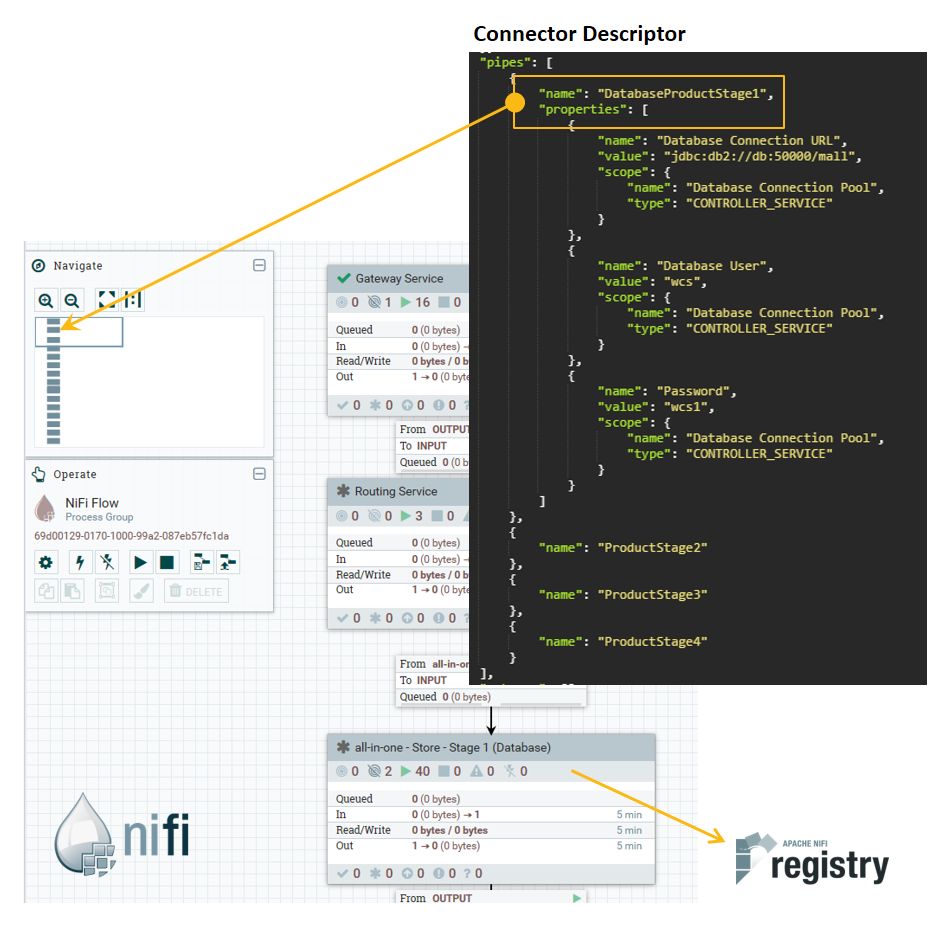 Définissez votre connecteur. Un connecteur est un ensemble de canaux ou de pipelines, regroupés sous forme d'unité de traitement unique. L'outil standard pour la construction de connecteurs est l'interface Apache NiFi. Vous pouvez utiliser la console NiFi pour décrire les relations entre les pipelines qui traitent les données entrantes. Plusieurs pipelines de traitement peuvent être reliés les uns aux autres pour former une série de pipelines à l'intérieur d'un connecteur, y compris un pipeline personnalisé créé par les clients. La sortie est un descripteur de connecteur, que vous stockez dans ZooKeeper. La console se trouve dans http://nifi_hostname:30600/nifi.
