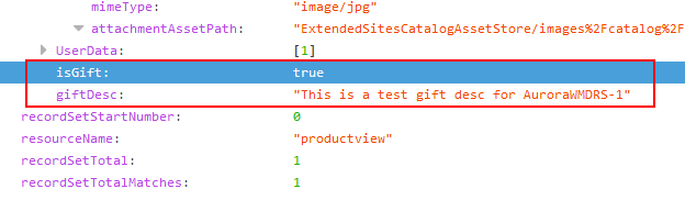 Assurez-vous que la réponse incluthttp://{searchhost}:{search-http-port}/search/resources/store/1/productview/byId/10001isGiftetgiftDescdans les zones de retour et que les valeurs correspondent aux valeurs de la tableXGIFT.