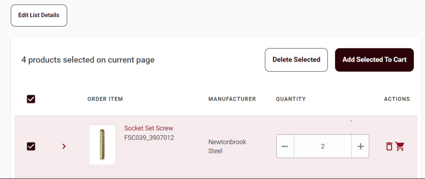 Lors d'un clic sur le nom d'une liste préconfigurée, le système redirige l'utilisateur vers la page de détails de la liste préconfigurée. Cette page affiche des informations telles que les articles commandés, les noms des fabricants, les quantités de produits, ainsi que des boutons d'action. Les utilisateurs peuvent effectuer des actions telles que la suppression d'un article de la liste ou l'ajout d'un article à leur panier. Pour effectuer ces actions sur plusieurs éléments de liste, l'utilisateur peut cocher la case en regard de l'élément et cliquer sur les boutons
