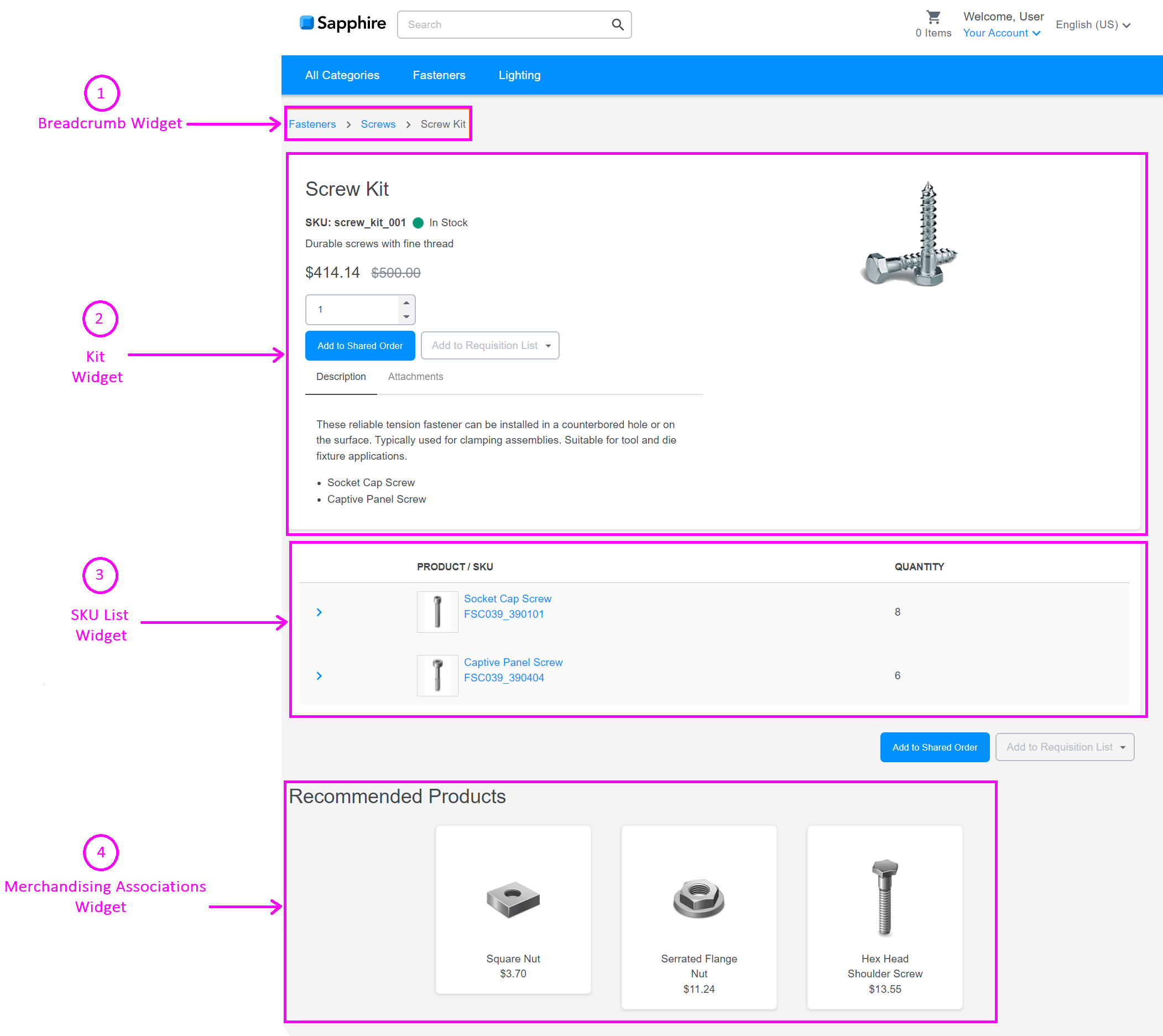 - Liste des SKU : affiche la liste des SKU sur une page de produit. Ce widget ne peut être utilisé qu'avec la page de produit et les modèles de page de produit B2B.