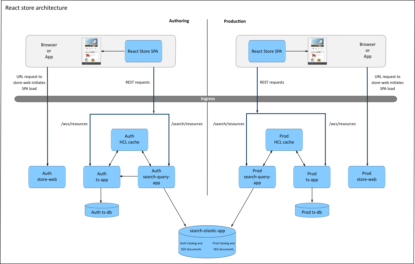 Les services REST sont tous conçus à partir du navigateur pour chaque client et sont acheminés depuis Ingress pour cibler les HCL Commerce Transaction server (ts-app) ou les services de requête de recherche (search-query-app). En tant que SPA, pour chaque requête de page suivante, seules les zones modifiées de la page sont actualisées et mises à jour (DOM virtuel).