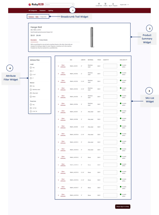 - Filtre d'attribut : affiche un filtre d'attribut sur la page de produit. Il peut être utilisé avec le widget Liste de SKU. Ce widget ne peut être utilisé qu'avec la page de produit et les modèles de page de produit B2B.