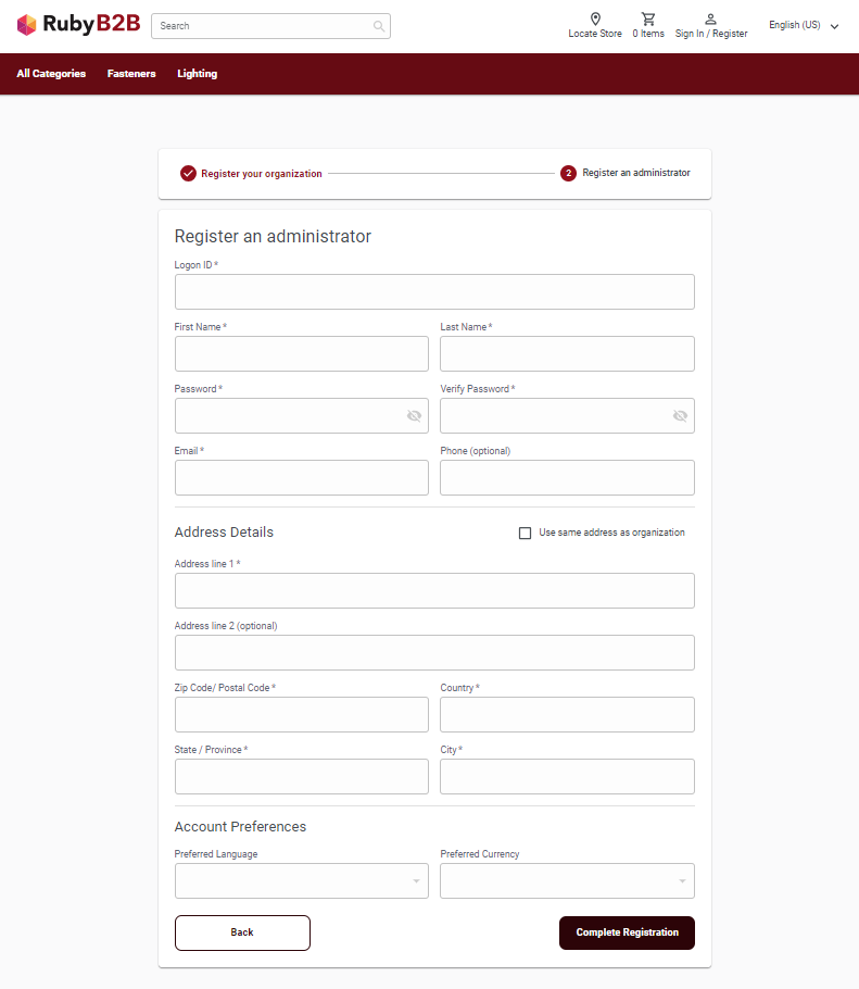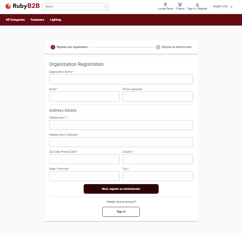 La page Inscription du magasin Ruby B2B prend en charge l'inscription d'une organisation et la désignation d'une personne qui agira en tant qu'administrateur de l'organisation.