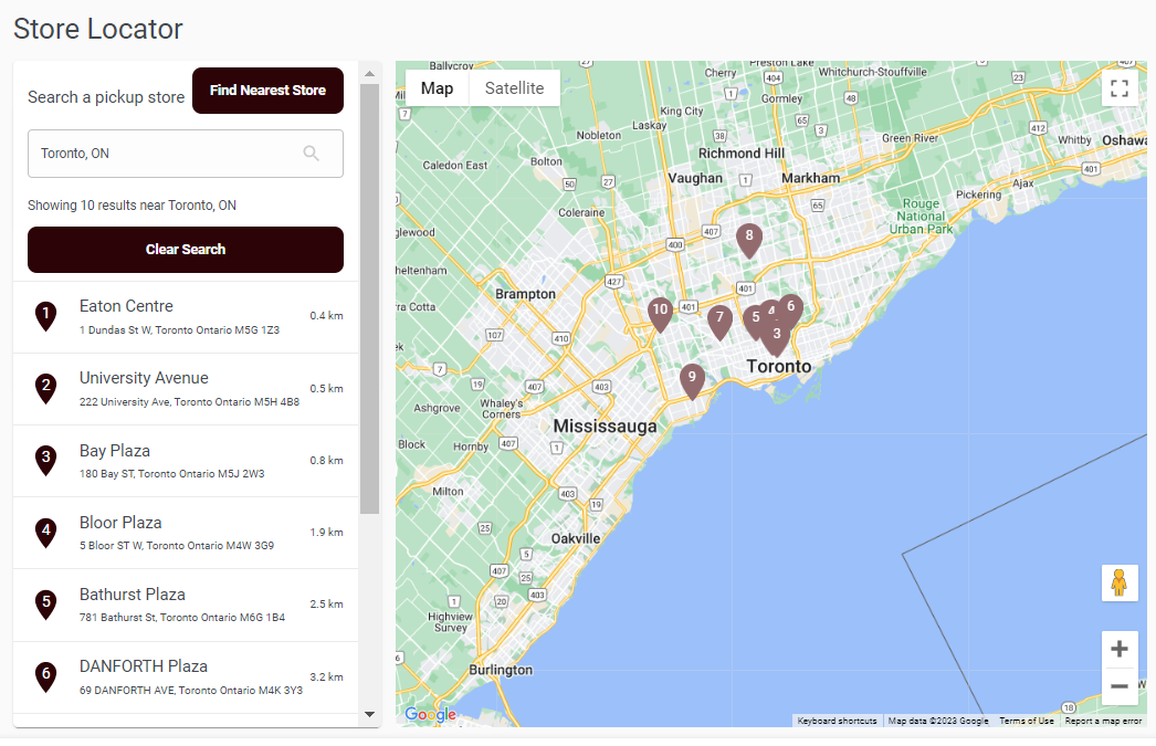 - Lors de l'aperçu d'un magasin dans le Management Center lorsque vous cliquez sur le lien Rechercher le magasin le plus proche, vous verrez la mappe d'emplacement de Toronto par défaut. En effet, le système n'est pas en mesure d'extraire les détails de l'emplacement dans un aperçu du magasin, mais il est en mesure de le faire dans la vitrine du magasin.