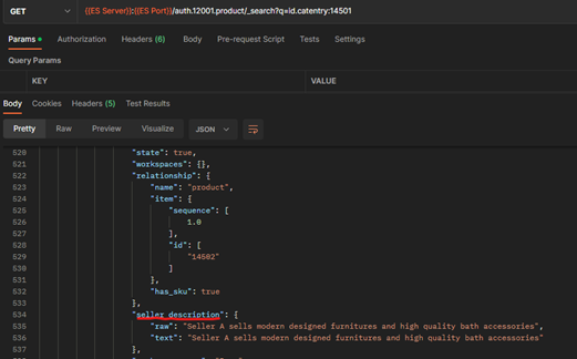 seller_description.rawà la section ResponseFields du profil de recherche existant.La réponse doit être similaire à :{ "profileName": "HCL_findCatalogEntrySKUs", "indexName": "product", "query": { "params": [ { "maxRows": "1200" }, { "sortField": "relationship.product.sequence asc" } ], "queryFields": [ "relationship.product.id" ], "provider": [ "com.hcl.commerce.search.internal.expression.provider.SearchInventoryExpressionProvider", "com.hcl.commerce.search.internal.expression.provider.SearchByPublishedEntryOnlyExpressionProvider", "com.hcl.commerce.search.internal.expression.provider.SearchByStorePathExpressionProvider", "com.hcl.commerce.search.internal.expression.provider.SearchBySellerExpressionProvider", "com.hcl.commerce.search.internal.expression.provider.SearchByCatalogExpressionProvider", "com.hcl.commerce.search.internal.expression.provider.SearchByLanguageExpressionProvider", "com.hcl.commerce.search.internal.expression.provider.SearchProductEntitlementExpressionProvider" ], "preprocessor": [], "postprocessor": [ "com.hcl.commerce.search.internal.expression.postprocessor.SearchMainCatalogEntryViewResultQueryPostprocessor", "com.hcl.commerce.search.internal.expression.postprocessor.SearchCatalogEntryViewPriceQueryPostprocessor", "com.hcl.commerce.search.internal.expression.postprocessor.SearchCatalogEntryViewUserDataQueryPostprocessor" ], "responseFields": [ "id.catentry", "id.store", "buyable", "id.catalog", "identifier.sku.raw", "name.raw", "name.override.raw", "description.raw", "description.override.raw", "url.thumbnail", "url.override.thumbnail", "url.image", "url.override.image", "keyword.text", "manufacturer.raw", "id.member", "seller.raw", "seller_description.raw", "type", "prices.*", "path.*", "relationship.product.id", "relationship.item.id", "attribute.source", "url.seo", "url.override.seo", "attachments.*", "images.*", "description.long" ] } }PUT http://QUERY_HOST:30920/search/resources/api/v2/documents/profiles/HCL_findCatalogEntrySKUsLa réponse doit être similaire à :{ "Profile created with name": "HCL_findCatalogEntrySKUs" } -
