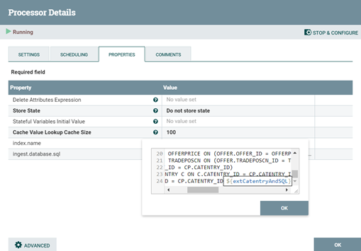 Note: Pour exécuter le groupe de processus personnalisés dans le pipeline NRT, vous devez ajouter des extensions dans la requête SQL à exécuter sur catentry ou Catgroup spécifique. C'est la raison pour laquelle la clause d'extension SQL est ajoutée dans le lien NRT du pipeline NiFi pour l'utiliser dans l'instruction SQL du processus personnalisé. Par exemple, ${extCatentryAndSQL}.