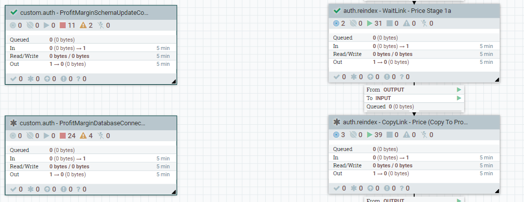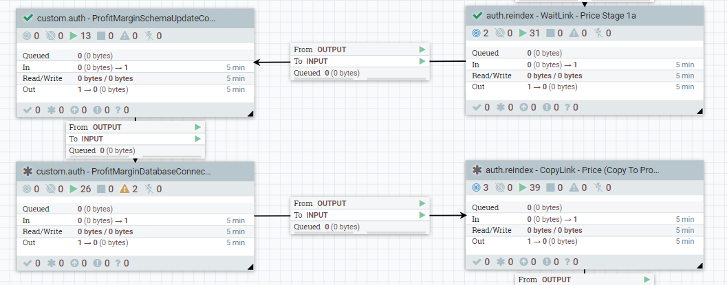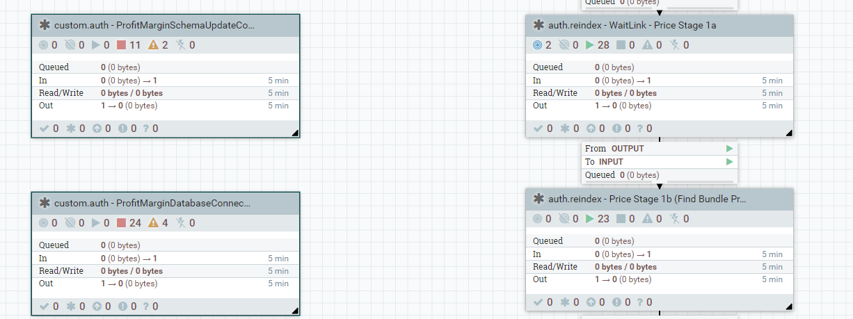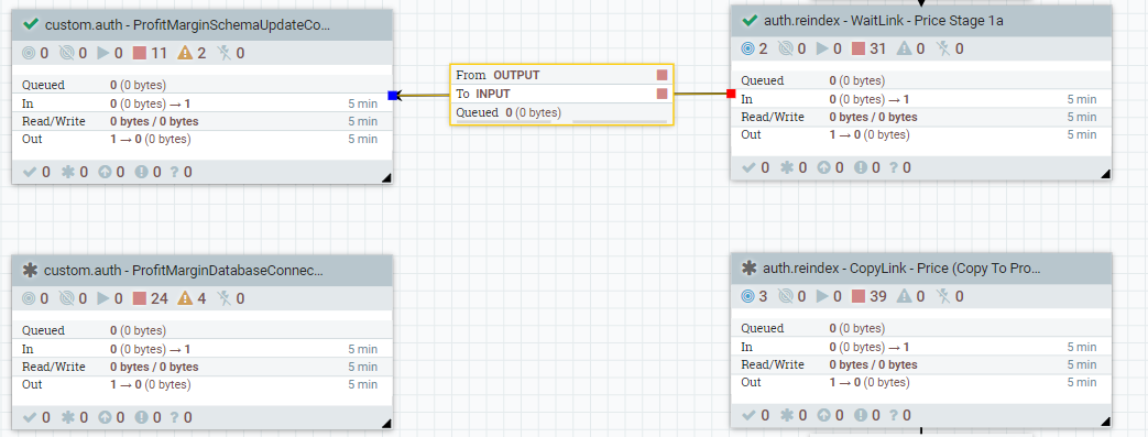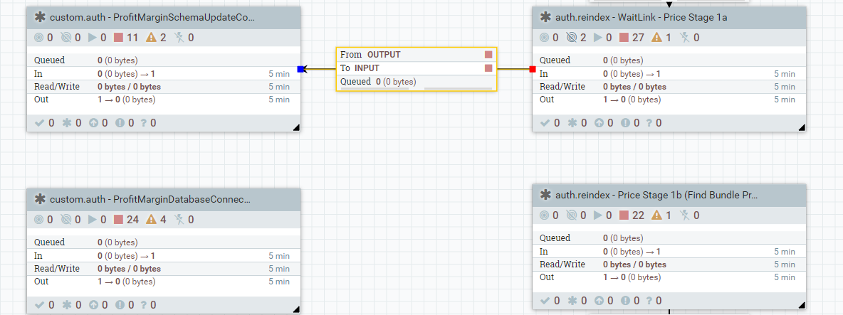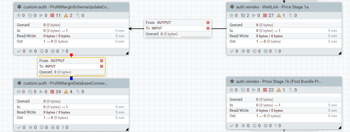 Dans cet exemple, établissez une connexion depuis "auth.reindex - WaitLink - Price Stage 1a" vers "custom.auth - ProfitMarginSchemaUpdateConnector".
