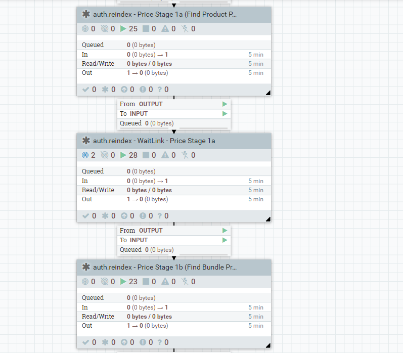 Dans cet exemple, les connecteurs PriceStage sont "auth.reindex - Price Stage 1b (Rechercher les prix du groupement)" suivis de "auth.reindex - WaitLink - Price Stage 1a".