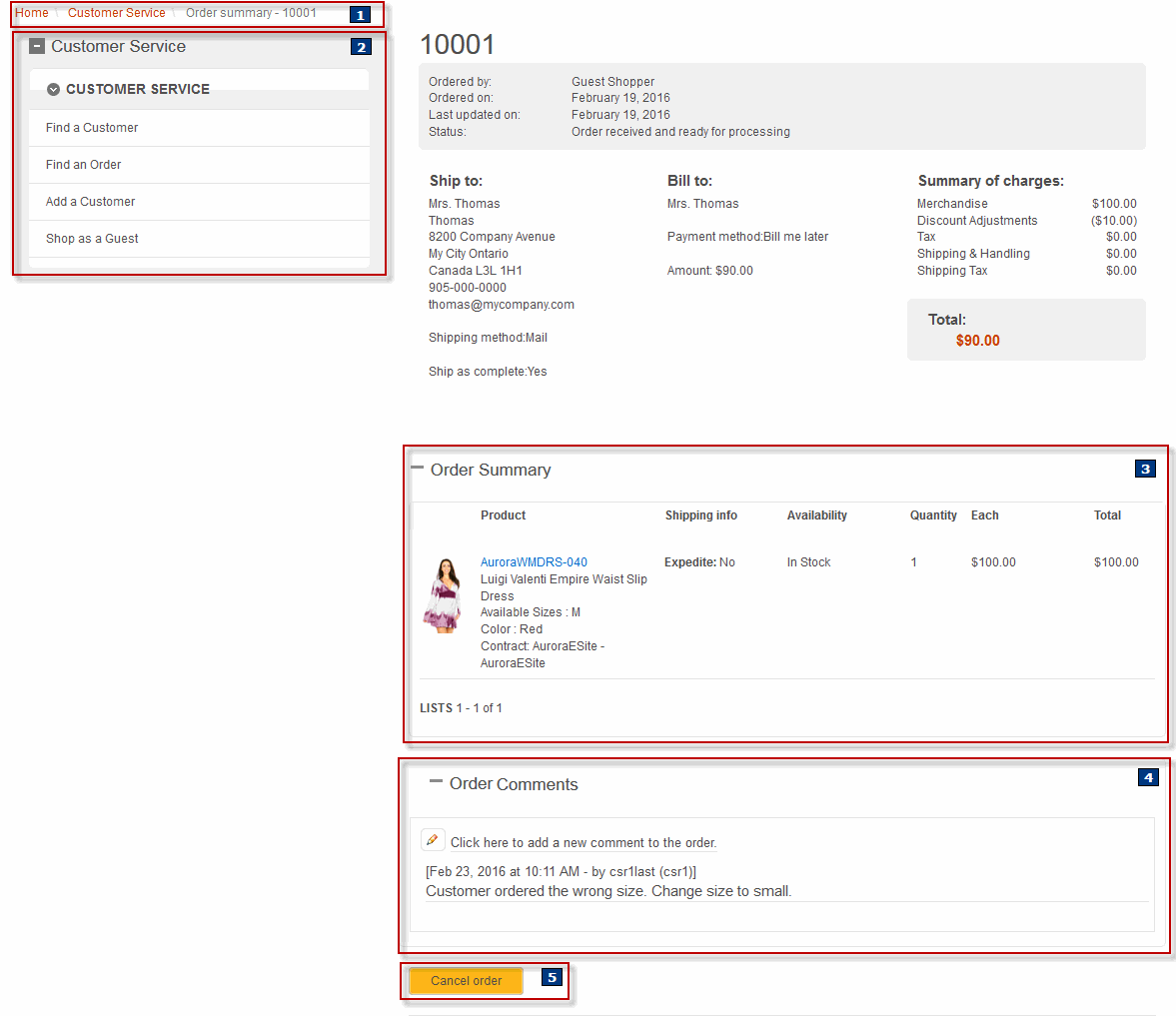 - 4OrderComments.jsp est le fichier JSP pour le widget Commentaires sur la commande qui est extensible et peut être utilisé par les représentants du service clientèle pour voir ou ajouter des commentaires à une commande spécifique. Les commentaires de commande sont horodatés et affichent également le nom du RSC qui a enregistré le commentaire.