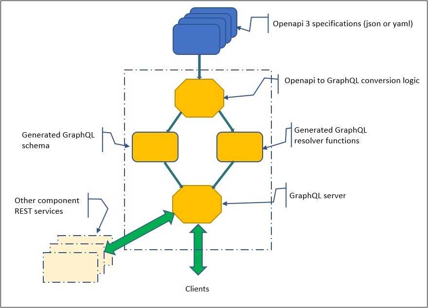 HCL Commerce fournit des fichiers de spécification OpenAPI 3.0 pour ses services REST. Le fournisseur GraphQL consomme ces spécifications REST et génère un schéma GraphQL qui expose la même fonction. Le fournisseur génère également un ensemble de fonctions de résolution qui implémentent les opérations GraphQL en déléguant aux services REST fournis par d'autres parties de HCL Commerce.