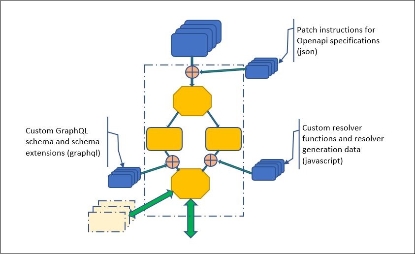 La modification et l'augmentation du schéma et des résolveurs résultants sont également possibles avec le service Commerce GraphQL afin de gérer les exigences que la logique de conversion ne couvre pas. Le diagramme ci-dessous présente trois points où des entrées supplémentaires sont acceptées :