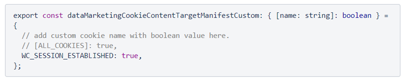 For example:export const dataMarketingCookieContentTargetManifestCustom: { [name: string]: boolean } = { mycookiename: true, }; - Save and close the manifestCustom.ts file.
