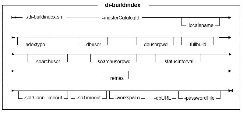 di-buildindex.sh-masterCatalogId masterCatalogId [-localename localename] [-indextype indextype] [-dbuser dbuser] [-dbuserpwd dbuserpwd] [-fullbuild true | false] [-statusInterval statusInterval] [-solrConnTimeout solrConnTimeout] [-soTimeout soTimeout] [-workspace workspaceId] [-retries retries] [-passwordFile passwordFile]