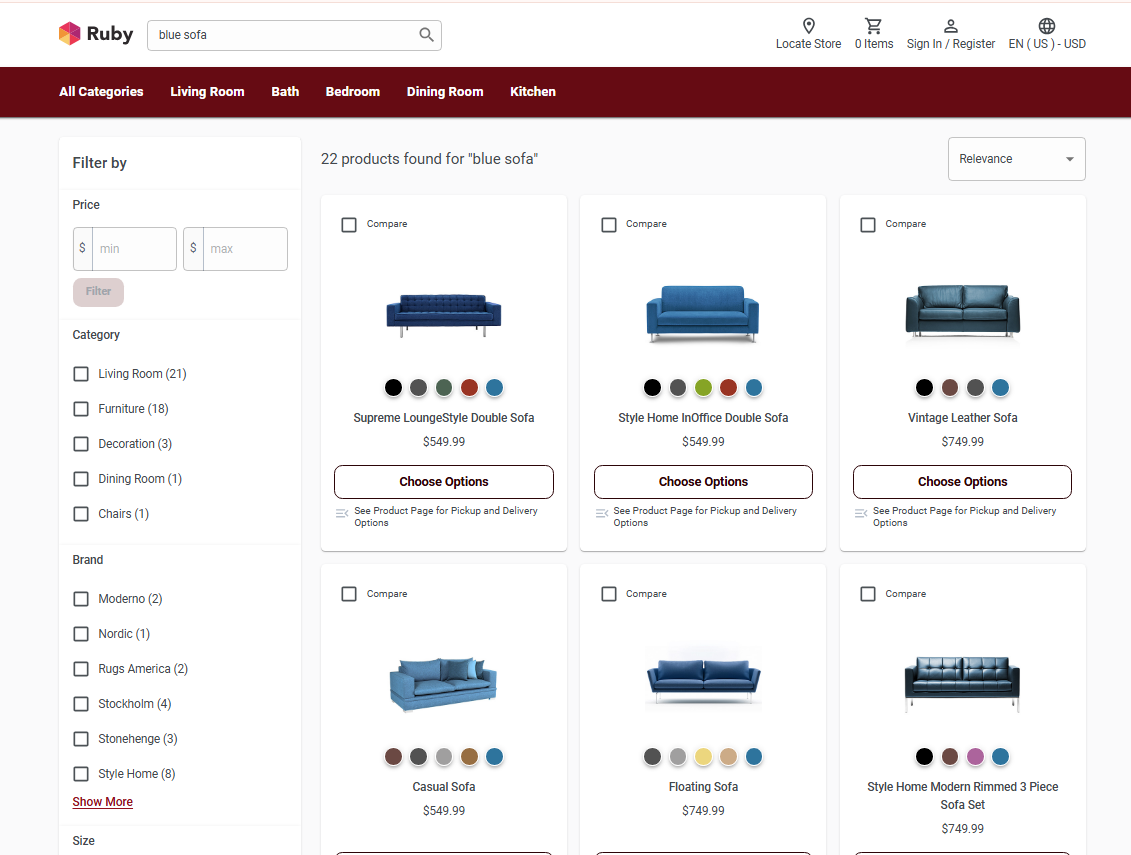 Search for Blue Sofa in the Ruby store to view results displaying Blue-colored Sofa on the product layout page.