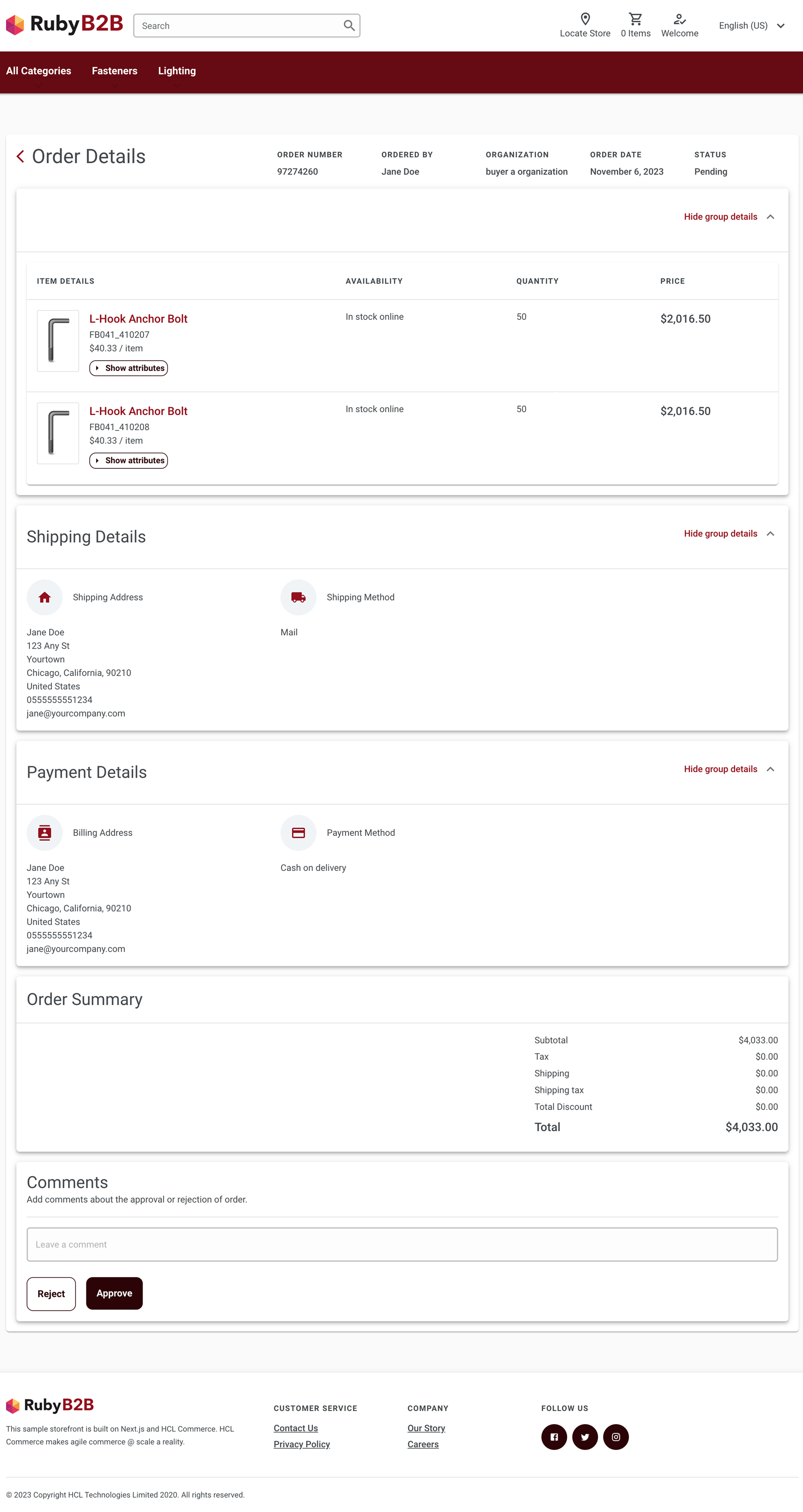 In the Ruby B2B store, Buyer Administrators and Buyer Approvers can view the Order Details page before deciding whether to approve or reject an order.