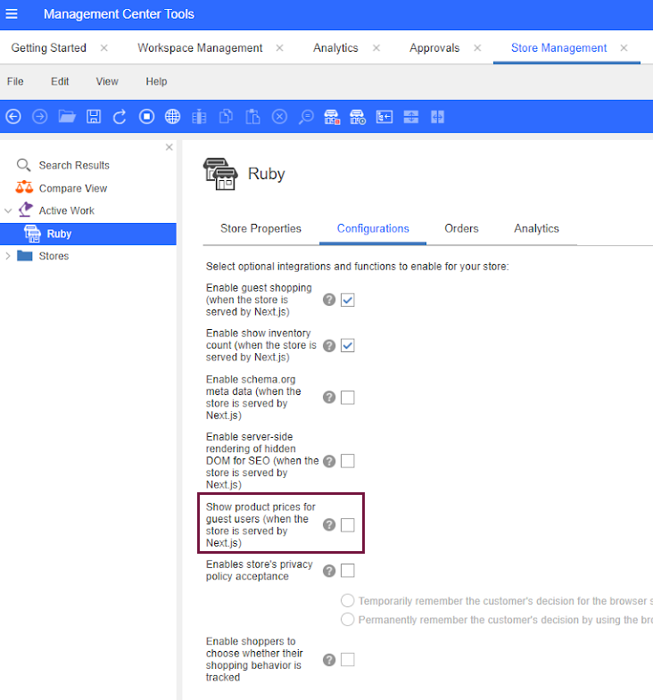 Note: If product prices are showing by default for guest users, deselect the Show product prices for guest users (when the store is served by Next.js) checkbox to hide them. - Click the Save button.